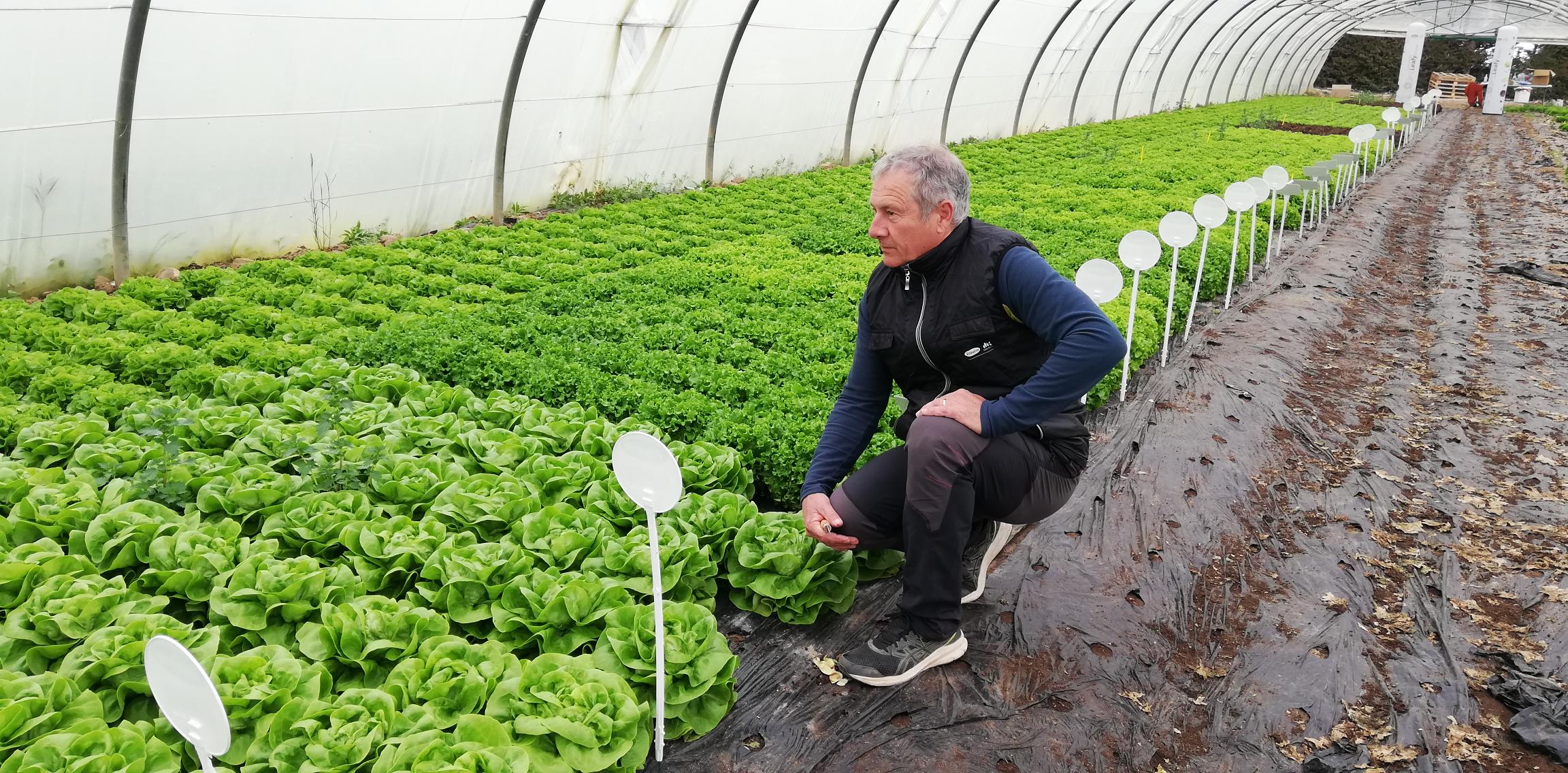 Fin mars 2023, nos interlocuteurs locaux Philippe Galle et Cécile Thomas ont accueilli leurs clients et les spécialistes du secteur sur une de nos plateformes d'essais de laitues d'abri à Eyragues.